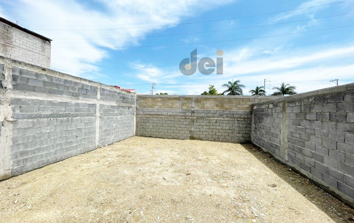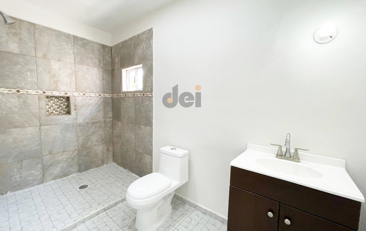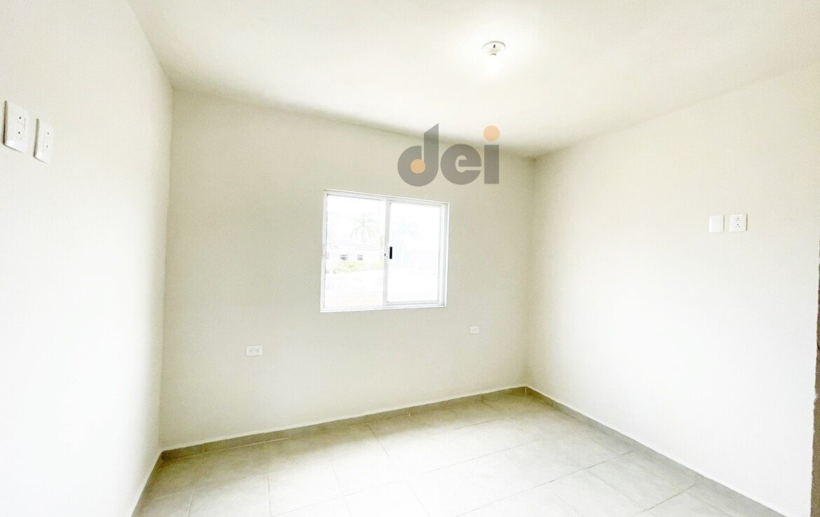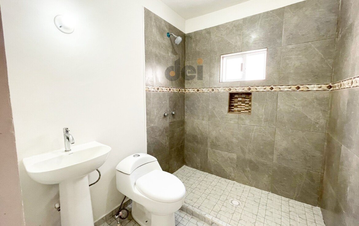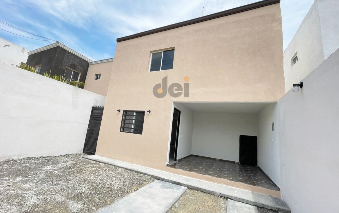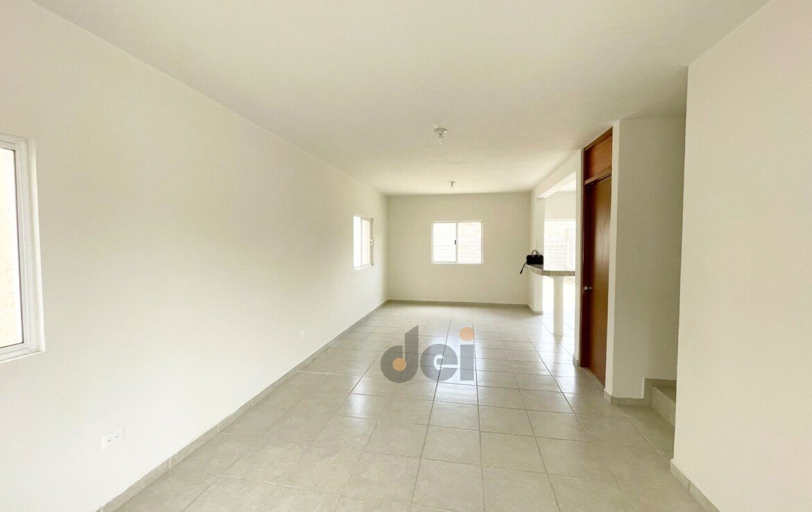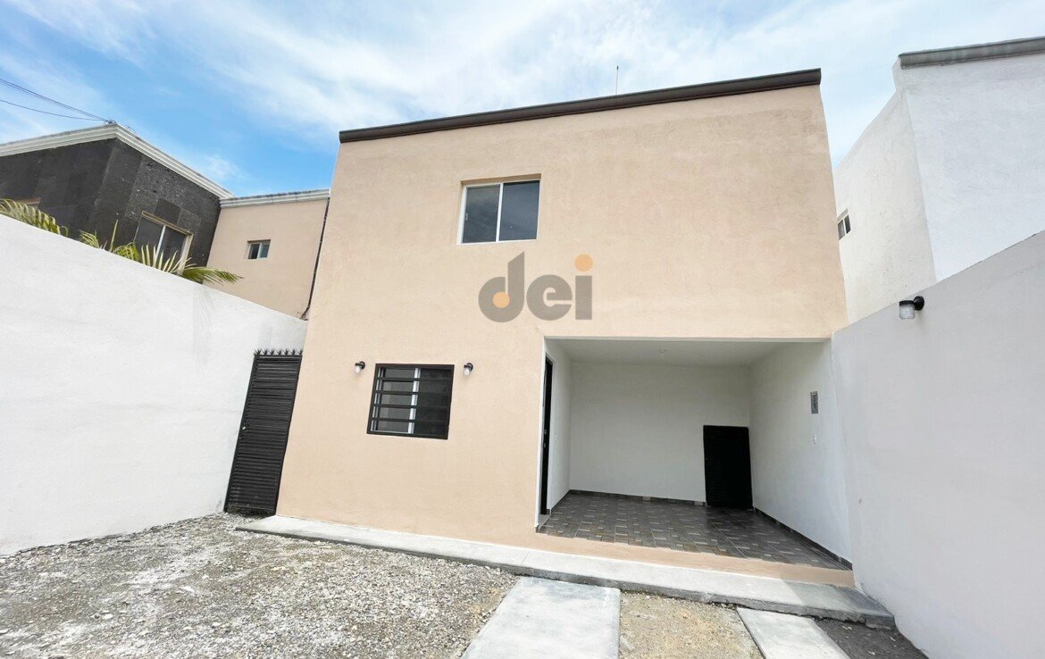 PLANTA BAJA. – Cochera con portón para un auto (espacio para una segunda cochera), porche, bodega, sala – comedor, cocina con barra de porcelanato, área de lavado techada, medio baño, jardín