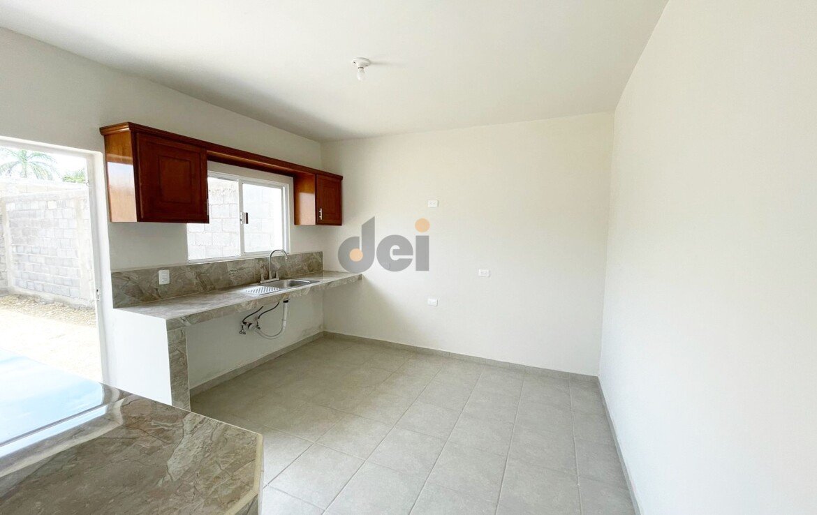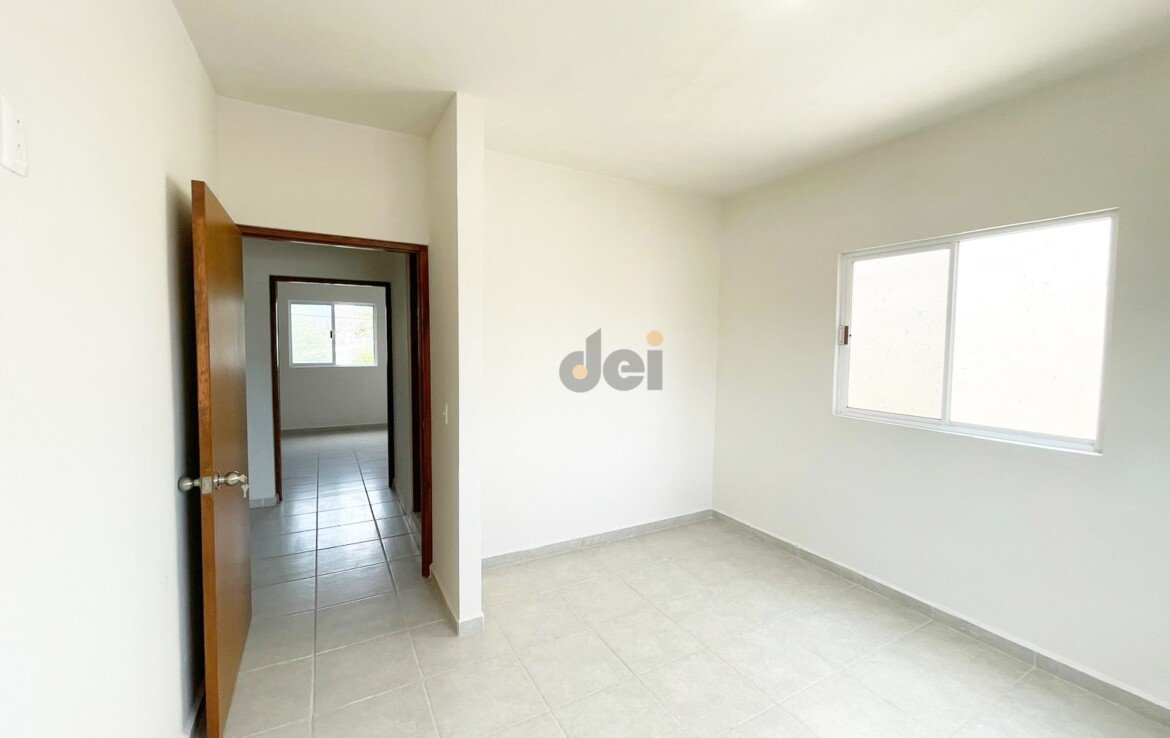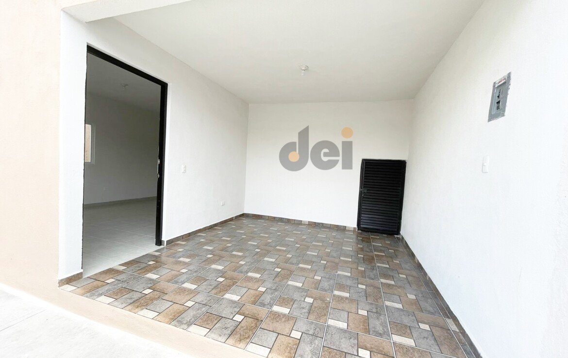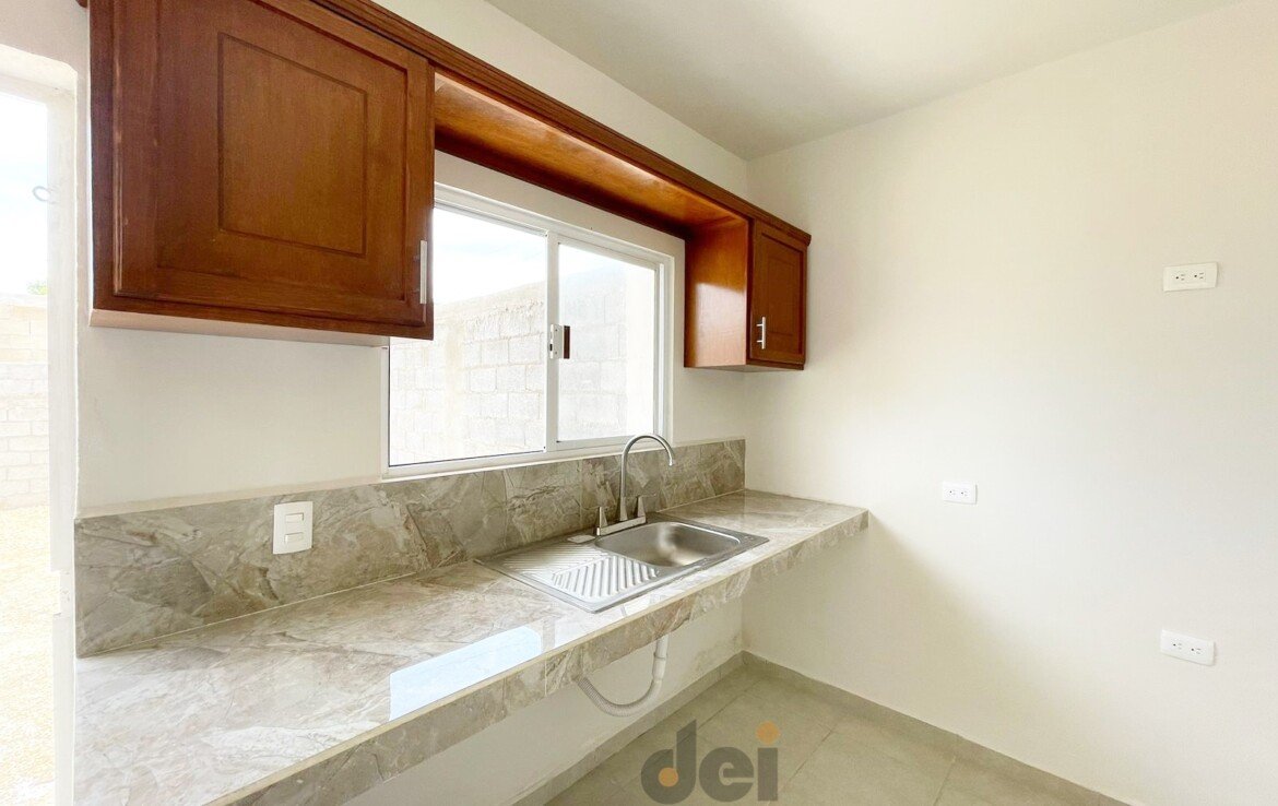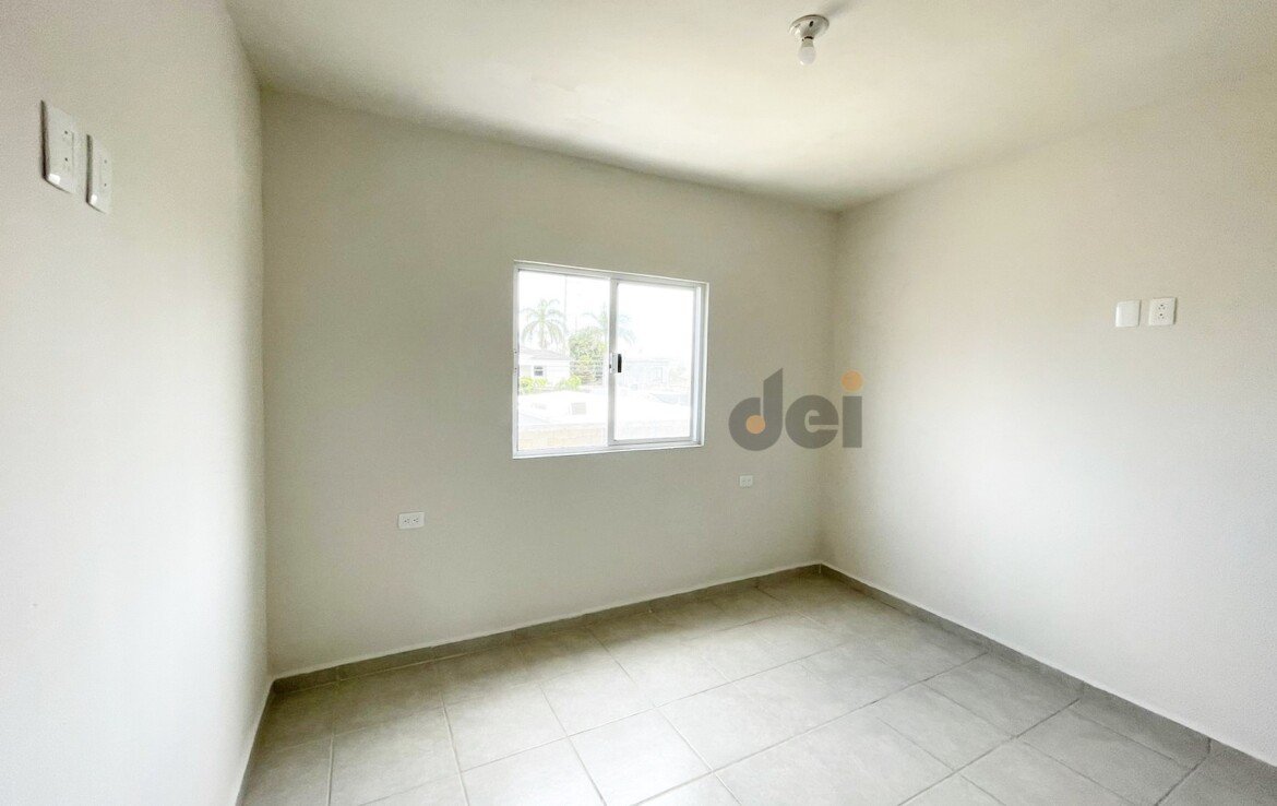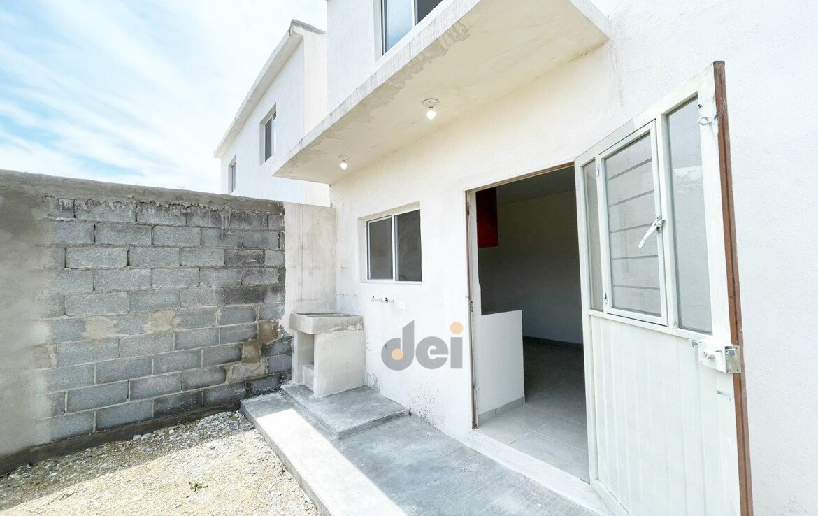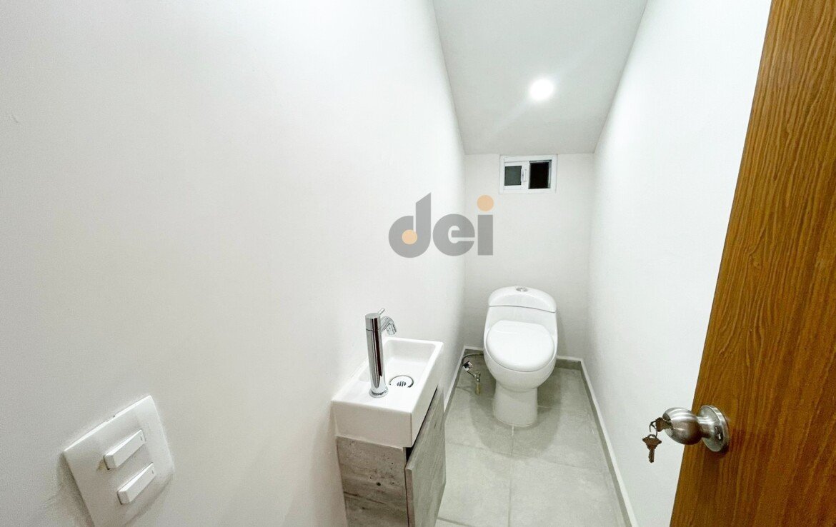 PLANTA BAJA. – Cochera con portón para un auto (espacio para una segunda cochera), porche, bodega, sala – comedor, cocina con barra de porcelanato, área de lavado techada, medio baño, jardín