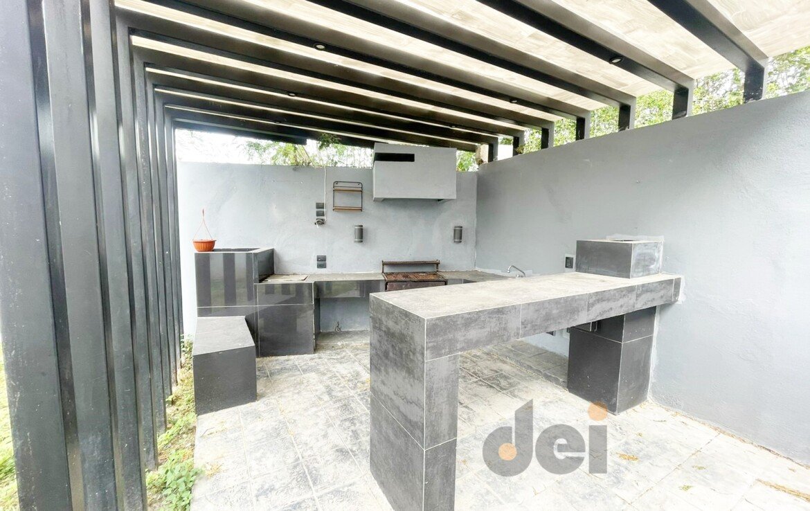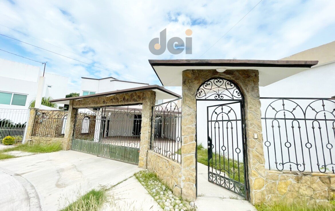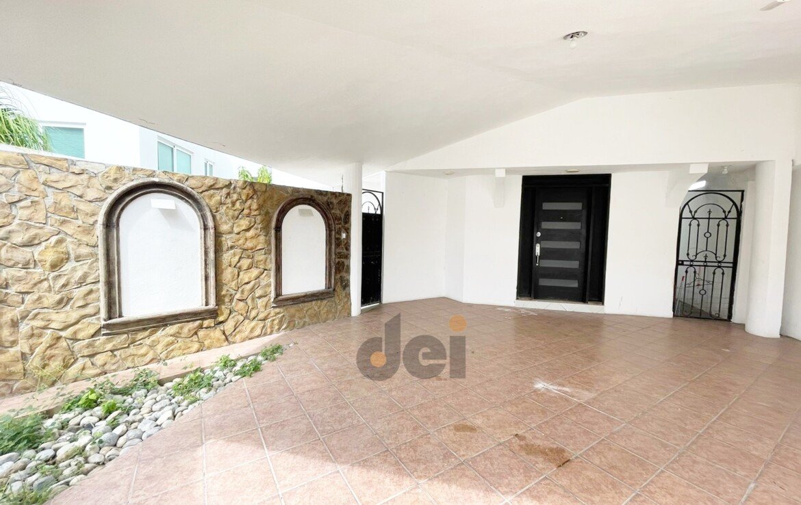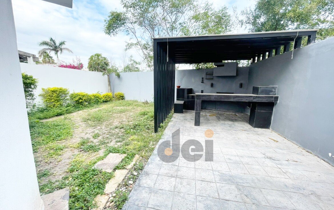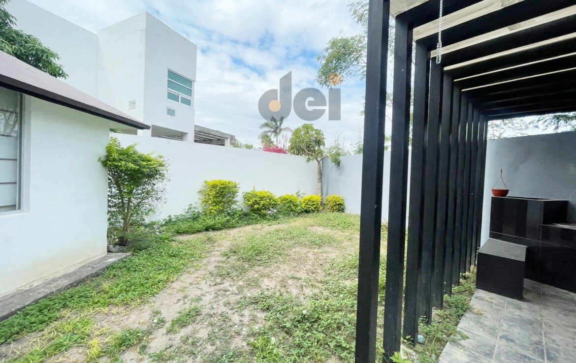 PLANTA BAJA. – Cochera techada para dos autos, recibidor, sala – comedor, bar, cocina integral, medio baño, jardín, área de asador con pérgola, hielera de acero inoxidable, patio de servicio con área de lavado