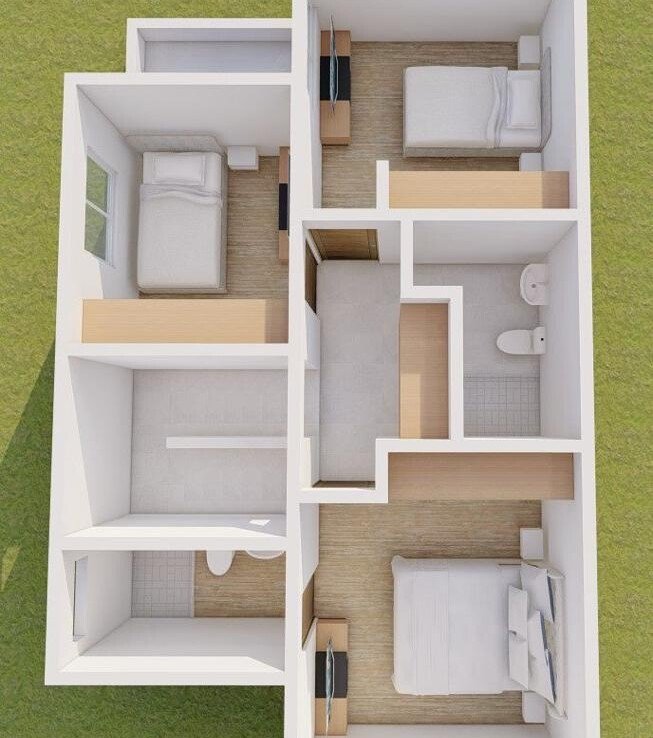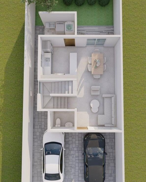 PLANTA BAJA.- Cochera para 2 autos, sala – comedor, cocina, medio baño lavandería, patio, terraza techada