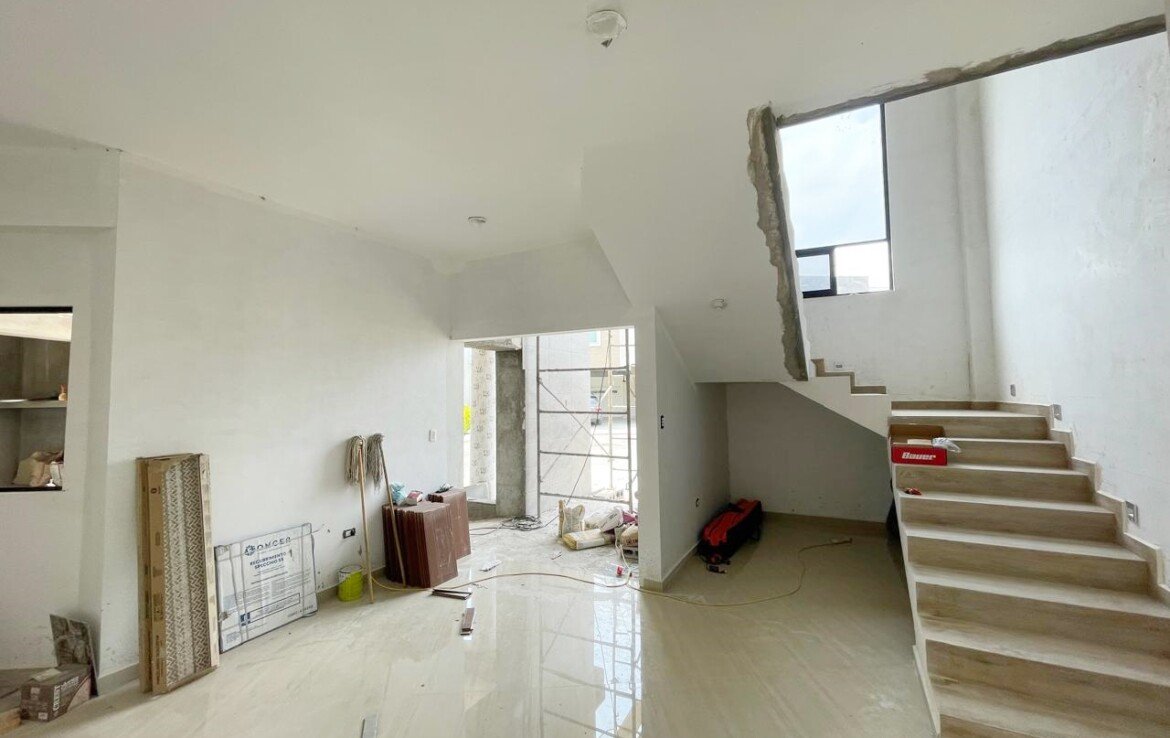PLANTA BAJA. – Cochera techada para 2 autos, recibidor, sala – comedor doble altura, cocina, medio baño, cuarto de lavandería, 1 recamara con vestidor y baño completo, cuarto de servicio