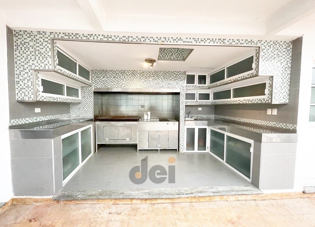 Patio con asador de acero inoxidable, dos baños independientes y bodega